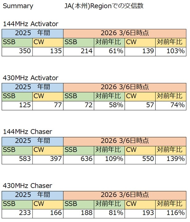 2025年の年間QSO数と2026年の3月6日時点(実質2か月)でのQSO数を144MHz、430MHzのSSBとCWモードをアクティベータとチェイサーでそれぞれ調べてみました。結果がこれです。