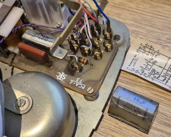 動作確認をしたところ、数字「1」は正常にDTMFに変換されるものの、「2」以降が正しくDTMFにならない状態でした。ベルが鳴るように戻した配線を外すと正しく変換されることから、Dialor 2.0の不良ではないようです。しばらく悩んでいましたが、結局、C1(1.5uF/250V)をメタライズド・フィルム・キャパシター(1uF/250V)に交換したところ、発信できるようになりました。