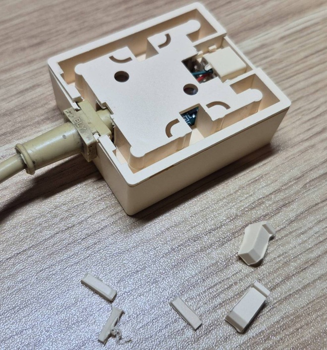 電話線にラグ端子を取り付け、ケースを超音波カッターで加工して、見た目も含めてスッキリ接続できるようになりました。