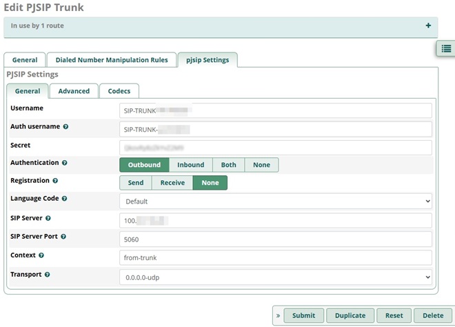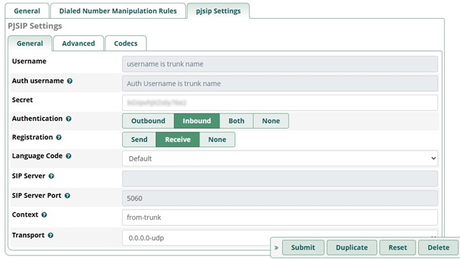 ③各局が提供しているSIP Username / PasswordをFreePBXのPJSIP Trunkに設定する