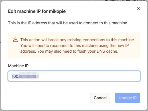 対応策として、非推奨ではありますが、TailscaleのAdmin Consoleから該当ノードのIPアドレスを編集し、相手局が提示しているIPアドレスと一致させることで、本事象が解消されます。