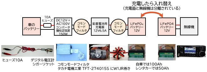 宿での充電に加えて、走行中(エンジン起動中)にも充電しています。車のバッテリーを電源として、DC12V→AC100Vコンバーターを介して無線機用バッテリーの充電器に給電します(図1)。2個のバッテリーは1個を充電用、もう1個を放電用にして(残容量が多い=電圧が高い方を放電用にする)、充電器と無線機を電気的に切り離すことで、充電しながら運用してもノイズの影響が抑えられます。
