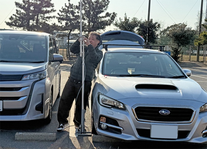 スタッフとMasacoさんはワゴン車で午前9時半に現地入り。ここで1エリアの移動運用を毎回サポートいただいているJQ1XLC小松さんと合流し、3人で分担しながらアンテナと無線機のセッティングを始めました。