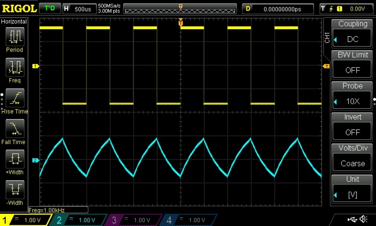 黄色が入力信号となる1kHzの矩形波、青色がRC LPFを1段通した後の出力波形です。RC LPFに矩形波を通すとその出力はサメの背ビレのように三角形のような形をした波形になりますが、正弦波の形ではありません。
