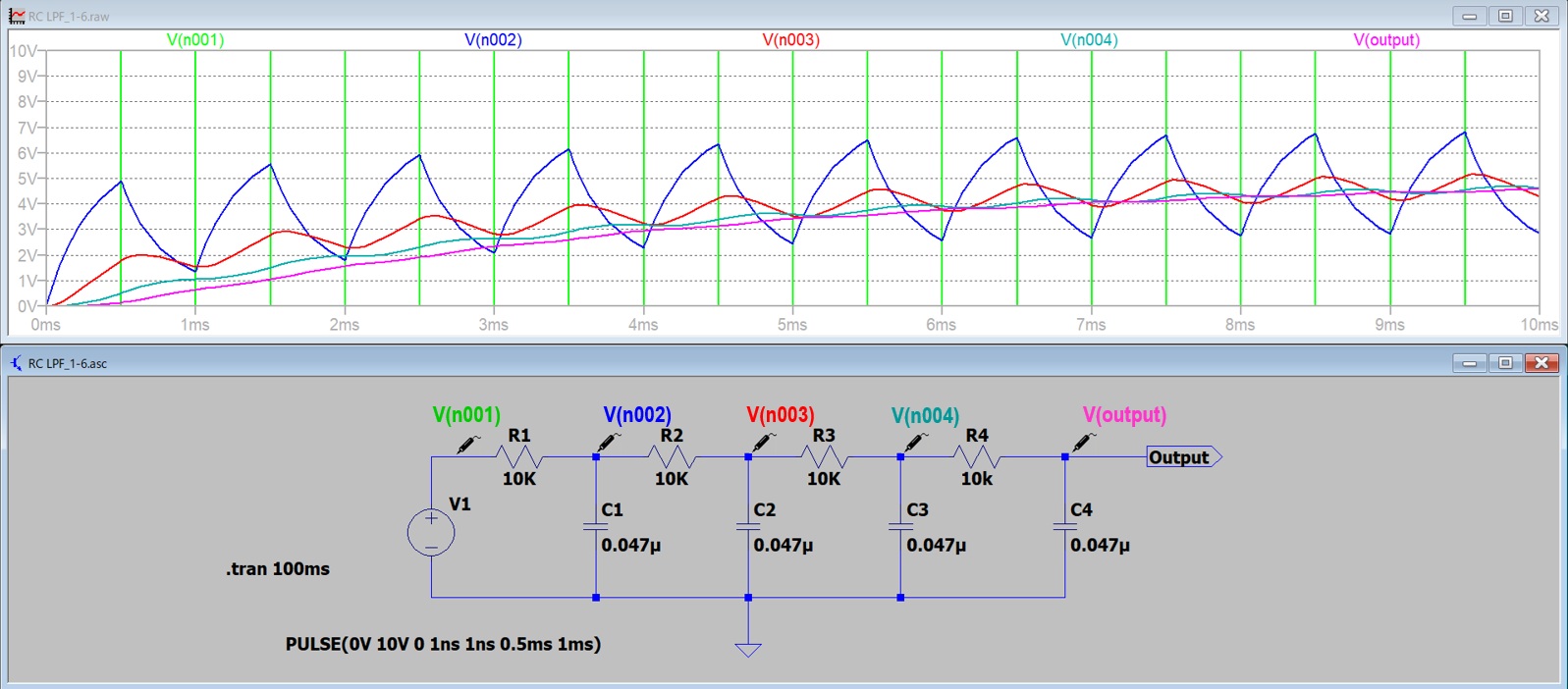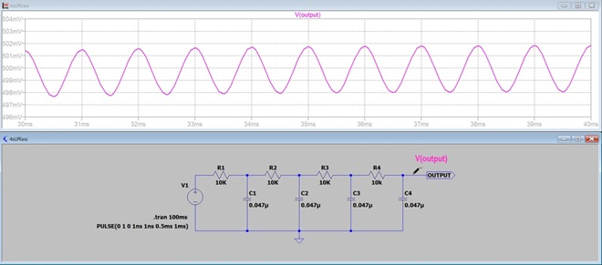 図5の下段がRとCだけで構成されたRC LPFの回路です。RC LPFを4段シリーズ接続しています。この4段のRC LPFの入力に矩形波V(n001)を入力したときの各ポイントの出力波形をLTspiceでシミュレーションした波形がそれぞれV(n002)、V(n003)、V(n004)、V(output)です。それぞれの出力波形が図5の上段に表示されています。