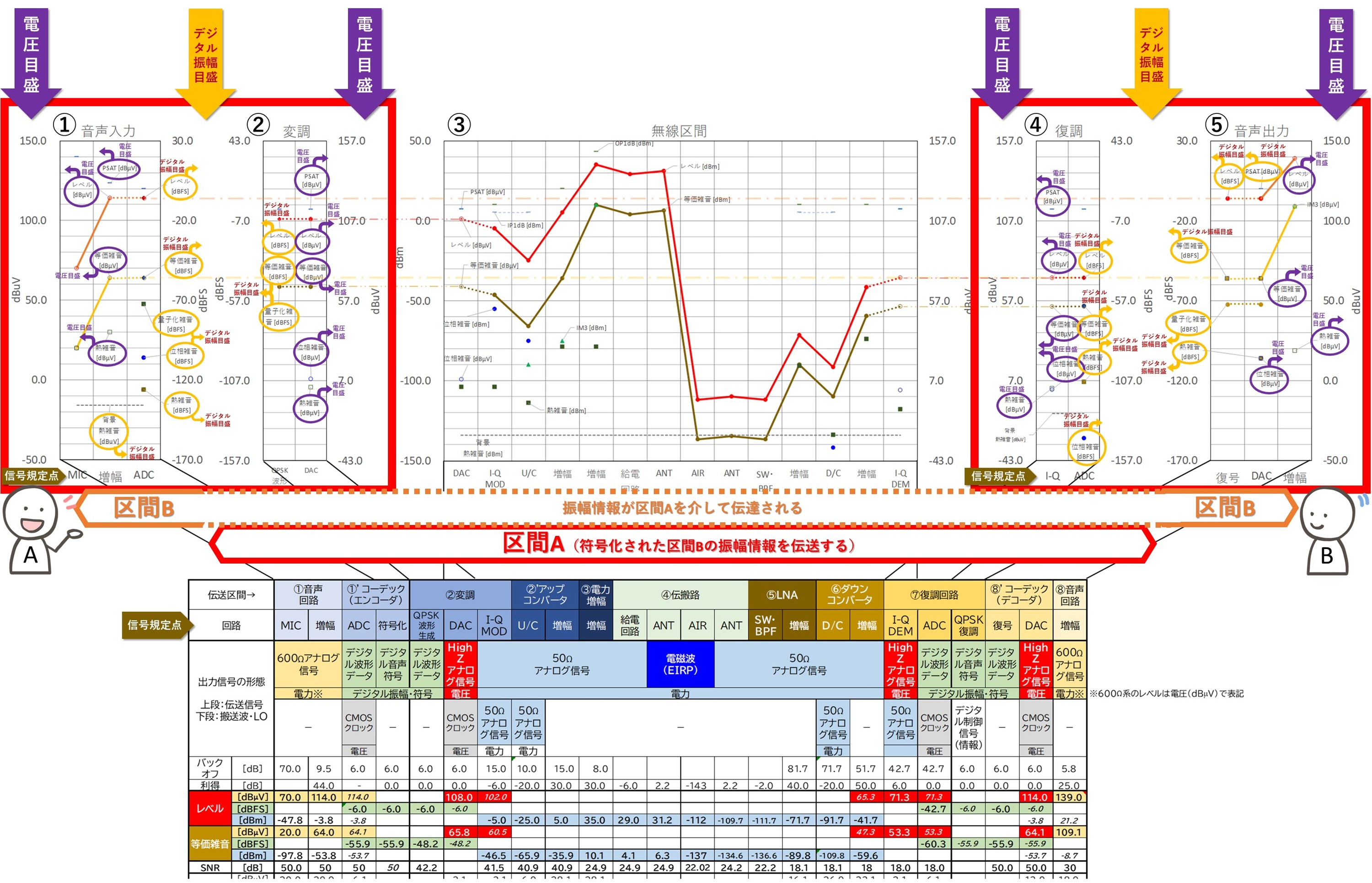 前回に引き続き、図1は第16話の図5「一気通貫で作成したレベルダイヤグラム」に、今回取り扱う「①音声入力」「②変調」「④復調」「⑤音声出力」の各区間の縦軸の読み取り方を示したものです。ここに書かれた一連のグラフのうち赤枠で囲った部分「①音声入力」「②変調」と「④復調」「⑤音声出力」の縦軸はそれぞれ両端が電圧[dBµV]、中央がデジタル振幅[dBFS]です。なお[dBFS]の“FS”は第3話の表1に示したとおりFull Scaleの略です。つまり①~②の区間と④~⑤の区間はデジタル信号処理のブロックで、入出力をアナログ電圧でインタフェースしていることが判ります。ここでは塗り潰されているマーカと実線はデジタル振幅(dBFS)、塗りつぶされていないマーカと破線は「③無線区間」と同じく電圧(dBµV)のプロットです。どちらの縦軸を参照すれば良いかはデータラベルに記載されている単位を見て判断します。