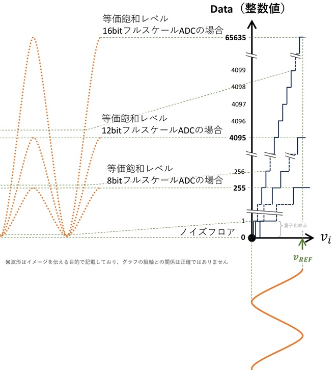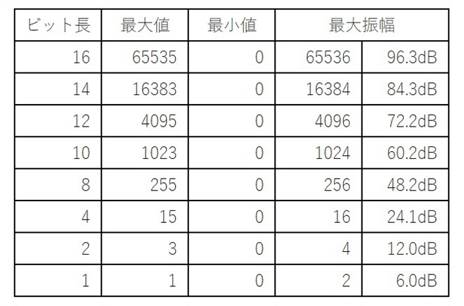 本表から判るように、整数型データのビット長とは2進数の1桁なので、1桁増える毎に最大振幅、すなわち表現できる数値幅は2倍(+6dB)に増えることになります。