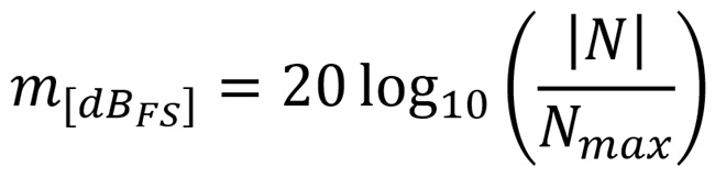 [dBFS]はデジタル空間の信号振幅を表現するデシベルです。振幅なのでアナログ領域の“電圧[dBµV]”に該当します。振幅の大きさをN、ビット空間で取り扱える最大振幅をNmaxとすると、m[dBFS]への換算は