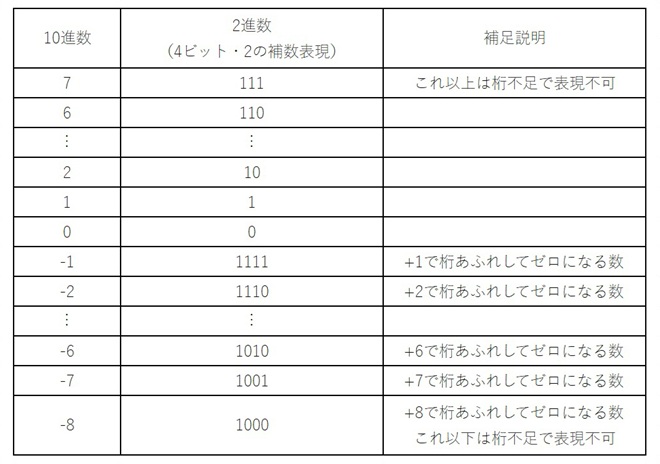 一般にコンピュータを用いた数値演算(整数演算)においてマイナスの数を表現する際は、表3に示すような「2の補数」を用います。