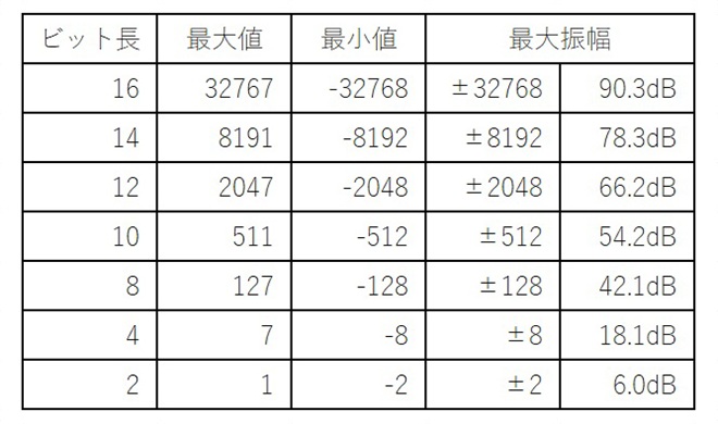 表4 負数を扱う整数型データのビット長と振幅の関係