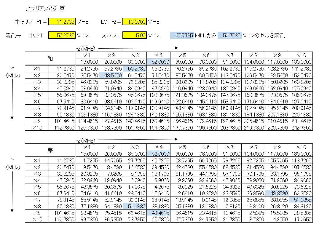 使い方ですが、キャリアの周波数をf1として黄色のセルに入れます。ここでは11.2735MHzとしています。LOの周波数をf2として黄色のセルに入れます。ここでは3逓倍を考えて13.0MHzにしています。すると、それぞれ10倍波までの和と差を全て計算します。次に目的とする中心周波数に50.235MHz、スパンを5MHzと記入します。すると47.735~52.735MHzの範囲、つまり近接スプリアスとなりうる周波数のセルが薄いブルーになります。スパンの周波数は適宜変更して下さい。f2の×3にある一番上の行が取り出したい周波数の50.2735MHzになります。これはスプリアスではありませんが、薄いブルーになるのは仕方ありません。もちろん、どこまで高調波の影響があるのかは、その場合によって異なるのでしょう。とりあえず10倍波まで全部出ますので便利です。
