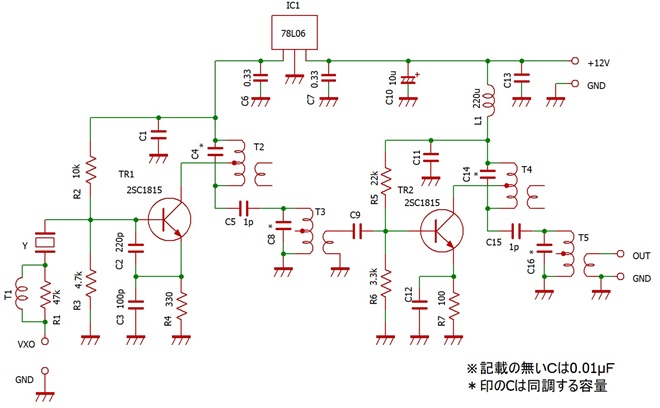 周波数構成は表1の通りと想定して、図1の回路を書いています。つまり、発振周波数はf=(50.3-11.2735)/3程度を想定していますので、ほぼクリスタルは13MHzとなります。もちろん部品もそれによって変わりますが、回路としては注釈で逃げています。なお、C5とC15は1pFとしていますが、もう少し大きくする方が良い場合もあります。