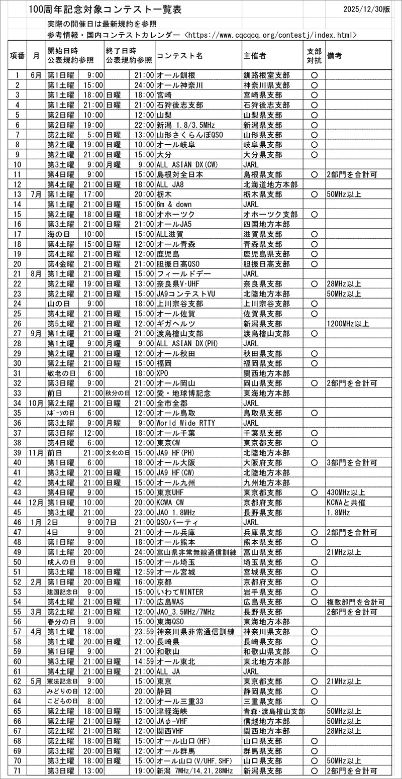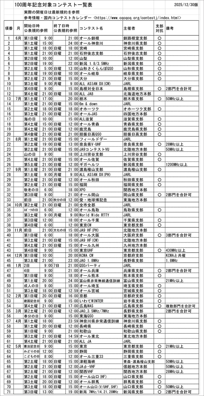 「100周年記念アクティビティコンテスト」の対象になるコンテスト(JARL発表の規約より)