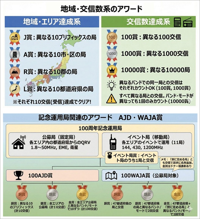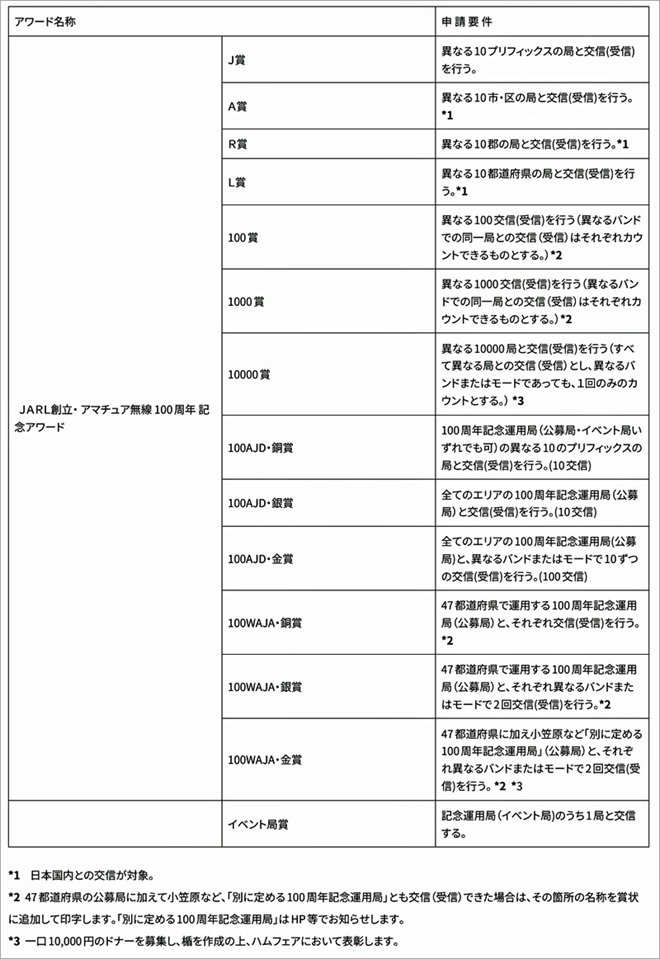 2026年6月1日から2027年9月30日24時(JST)までの交信が有効のアワード。異なる10プリフィックスの局と交信(受信)を行う「J賞」から、47都道府県に加え小笠原など「別に定める100周年記念運用局」(公募局)とそれぞれ異なるバンドまたはモードで2回交信(受信)を行うという「100WAJA・金賞」まで、14種類のアワードが用意されている。申請受付期間は2026年6月1日から2027年12月31日まで。