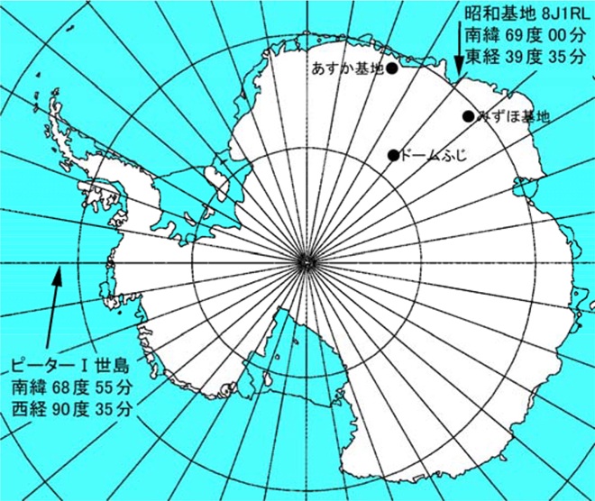 日本の南極観測の拠点である昭和基地は、南極大陸のインド洋側、リュツォ・ホルム湾東岸にある東オングル島に設けられている(JARL Webより)