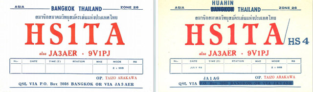 写真10. (左) HS1TAのQSLカード。 (右) HS1TA/HS4のQSLカード。