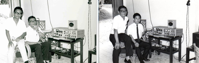 筆者JA3AERは早川電機株式会社(現シャープ株式会社))の駐在員として、1967年から1969年にかけて約2年間タイの首都バンコクに駐在したが、この国で運用できるとは夢にも思っていなかった。しかし、1968年4月、香港で紹介してもらったHS1CB, Chankijに会って一挙にタイのハム界の様子がわかった(写真7)。そのころタイ政府はアマチュア無線局を認めていなかったが、それを取り締まる法律もなく、STAR (Society of Thai Amateur Radio)の会員になれば会員証にコールサインが記入され(写真8の左)、政府もそれを黙認しているという状況であった。