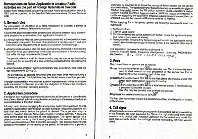 スウェーデン在住のSM0HEG (JA3DHZ)笠松善男氏(写真9)から次のようなレポートを頂いた。「毎週末QRVです。アンテナの関係でHome QTHから60kmの所にシャックがあります。Long.(東経)18.43.5, Lat.(北緯)59.19.9の所がポジションです。ストックホルムの多島海の中にあり、OH0との間にあるスウェーデンとの本島の方に近い島です。 橋が架かっているので島と呼ぶのも何かと思いますが、近くの入江まで300mで海抜20~30m位の所です。土地の面積は約300㎡で建ぺい率は(60㎡+40㎡)ですから幾らですか? シャックが建っています。アンテナも、現在14, 18, 21, 24, 28MHzが運用可能です。(1991年10月記)」 笠松善男氏は1972年6月8日にJA3DHZ/SM0でAクラスの臨時免許を得、1975年9月30日にBクラスの資格試験に合格されて(写真10の左)、1975年10月7日にSM0HEGの免許を取得しておられ(写真10の右)、当時のスウェーデンのルールも送ってくれた(写真11及び12)。尚、1990年11月1日には同じコールサインSM0HEGでCEPTライセンスを得ておられる(写真13)。また、1974年にJA4WNR/SM4で臨時免許を得られた杉原多二雄氏によると、笠松善男氏とは1974年の時点でJA3DHZ/SM0とQSOしたとの事である。