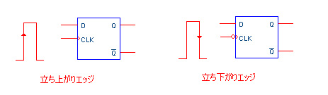 D-FFは次のような動作をします。PRとCLは他の入力端子に関係なくプリセットとクリヤーの動作をします。PRとCLがHの時、CLKの立ち上がりでDの状態を読み込みます。CLKの立ち上がり以外の時にはその状態を保持しています。従ってDとQを接続すると、Qは直前ではHのためCLKの立ち上がりでQがHになり、次の立ち上がりではLになるため、CLKの1/2周期で変化するので、つまり1/2分周器として働きます。入力部は立ち上がりで動作しますが、立ち上がりと立ち下がりエッジは図のように表します。