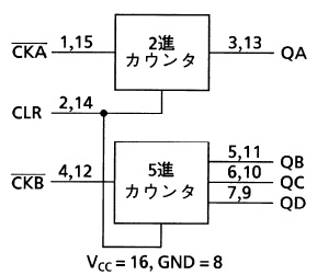 74HC390は2組の1/10カウンターが組み込まれています。1組の1/10カウンターは1/2と1/5に別れトータルで1/10になっています。2進カウンターの出力を5進カウンターに入力する方法とその逆の方法があります。2進カウンターを後にするとデューティ50%の出力波形が得られます。2進-5進のカウントの波形は図のようになっています。