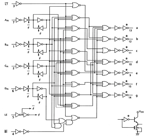 カウントしたデータ信号を一時的に保持するのがラッチです。この表示ドライバーにはラッチの機能もついています。カウンターからのBCD※データをLEがLの時読み込み、Hの時はそのまま保持します。ラッチ回路は前に説明したD-FFそのものです。