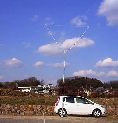 HFの移動運用に適したアンテナの一つとして、V型ダイポールアンテナがあります。これは1/2波長ダイポールアンテナのエレメント(片側1/4波長)を少し上向きに取り付けてV型の形状にしたアンテナで、18~28MHz用が手頃なサイズで製作できます。素材としてアルミ、ステンレス、釣竿、農業用資材のグラスファイバーポールなどが考えられます。