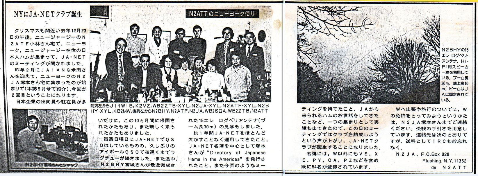 この年の12月にJANETクラブが発足したことを、筆者がCQ ham radio誌に投稿し、1980年3月号の「N2ATTのニューヨーク便り」のコラムに、「NYにJA-NETクラブ誕生」と題して掲載された(写真1)。それには、「クリスマスも間近い去年12月23日の午後、ニュージャージーのN2ATF小林さん宅で、ニューヨーク、ニュージャージー在住の日本人ハムが集まって、JA-NETのミーティングが開かれました。昨年2月にJA1ANG米田さんを迎えて、ニューヨークのN2JA塚本さん宅に集まった(写真2)のが始まりで(本誌5月号で紹介)、今回が2回目ということになります。日本企業の出向員や駐在員が多いだけに、この10カ月間に帰国されたかたもあり、また新しく来られたかたもありました。毎週日曜日にJA-NETでQSOはしているものの、久しぶりのアイボールQSOで夜遅くまでラグチューが続きました。また途中、N2BHY宮城さんが最近完成された15エレ・ログペリアンテナ(ブーム長30m)の見学もしました。約1年間JA-NETをほとんど欠かすことなく運用してきたこと、JA-NET名簿を中心として塚本さんが”Directory of Japanese Hams in the Americas”を発行されたこと、また今回のようなミーティングを持てたこと、JAから来られるハムのお世話をしてきたことなど、一つの集まりとして実績も出てきたので、この日のミーティングではクラブを結成しようという声が上がり、JA-NETクラブが誕生することになりました。名簿には、W以外にもVE, XE, PY, OA, PZなどを含め既に54名が登録されていますWへの出張や旅行のついでに、Wの免許をとってみようというかたは、N2JA塚本さんまでご連絡ください。受験の手引きを用意しています。(以下省略)」