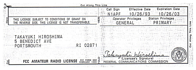 N1APFの免許を取られたJA1BNW廣島孝之氏(写真5)は当時ブラジルに駐在中で、米国の免許を取得した動機を次のように寄せてくれた。「ブラジルと米国の相互運用協定を活用して、ブラジルで運用するために取得した免許(写真6)です。目的は達成され、1980年にPY2ZTHのコ-ルを取得することが出来ました。その後、このFCCの免許はイタリ-でも認められ、I2ZKAを運用することが出来ました。また、4U1UN も運用させて頂きましたが、米国でのN1APFとしての運用はRIとNJで合計100局程度です。(1994年1月記)」 尚、廣島氏は「今月のハム」のコラムにも登場ですのでをご覧ください。