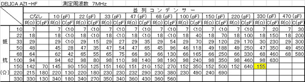 DELICAと同様に、抵抗とコンデンサーを並列に接続して値を色々変えて測定したところ、次の表のようになりました。使用した抵抗値はBR-200の目盛に合わせたものです。