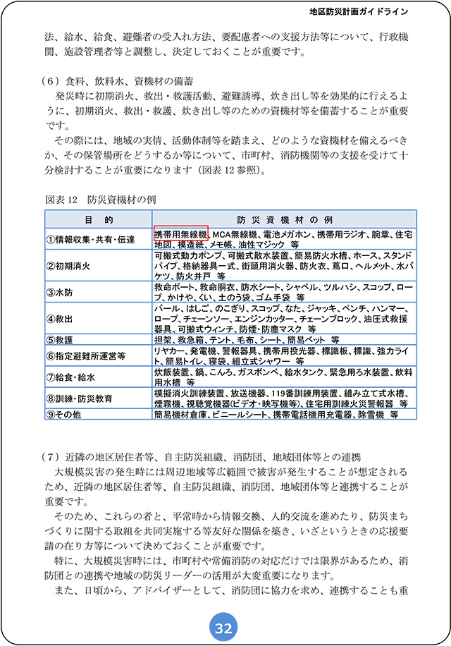 5月号の当コラムでは、内閣府の「地区防災計画ガイドライン」に触れましたが、この中にも情報収集・共有・伝達の目的を達成するための防災資機材の筆頭に「携帯用無線機」があります。