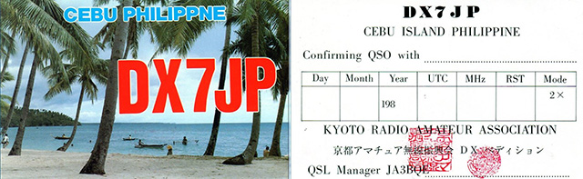 故JA3UB三好二郎氏は1984年9月にセブ島でDX7JPのコールサインで行われた京都アマチュア無線振興会のDXペディションに協力したと、それを報じたCebu Amateur Radio Leagueの機関紙SPLATTERSのコピー(写真5)とQSLカード(写真6)を送ってくれていた。(1985年12月資料受領)