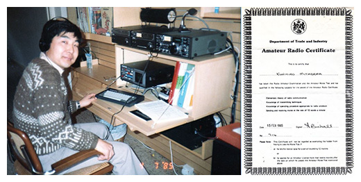 JI2MLN三田寺圀弘氏は、転勤先の英国で受験し、GW0ATMの免許を得て運用したとアンケートを寄せてくれた(写真2及び3)。「日本で半年毎に受験し、電話級、2級と進み、1級免許を受験しようとしたところで海外工場勤務となった。引越し荷物に無線機一式をつめて来たものの、日本 - 英国間にはまだ相互運用協定がなく、幸い同時期に免許条件から「英国々民であること」が削除されたため、現地の人達にまじって受験することにした。学科、実技(モールス送受信)ともに日本と同レベルであり、この点心配しなかったが、語学、特に専門用語の習得に苦しんだ。受験申し込みから受験までに約6ヶ月待たねばならなかったが、試験合格から開局までには約2週間しかかからず、この点日本と大きく違うところである。周囲の人たちの同意を得ないと新しい建造物が作れぬという法律があり、市街地では不細工なビームやタワーはほとんど建造不可能であるため、ベランダに取り付けた短縮ダイポールで主としてヨーロッパ内の交信を楽しんでいる。(1985年4月記)」