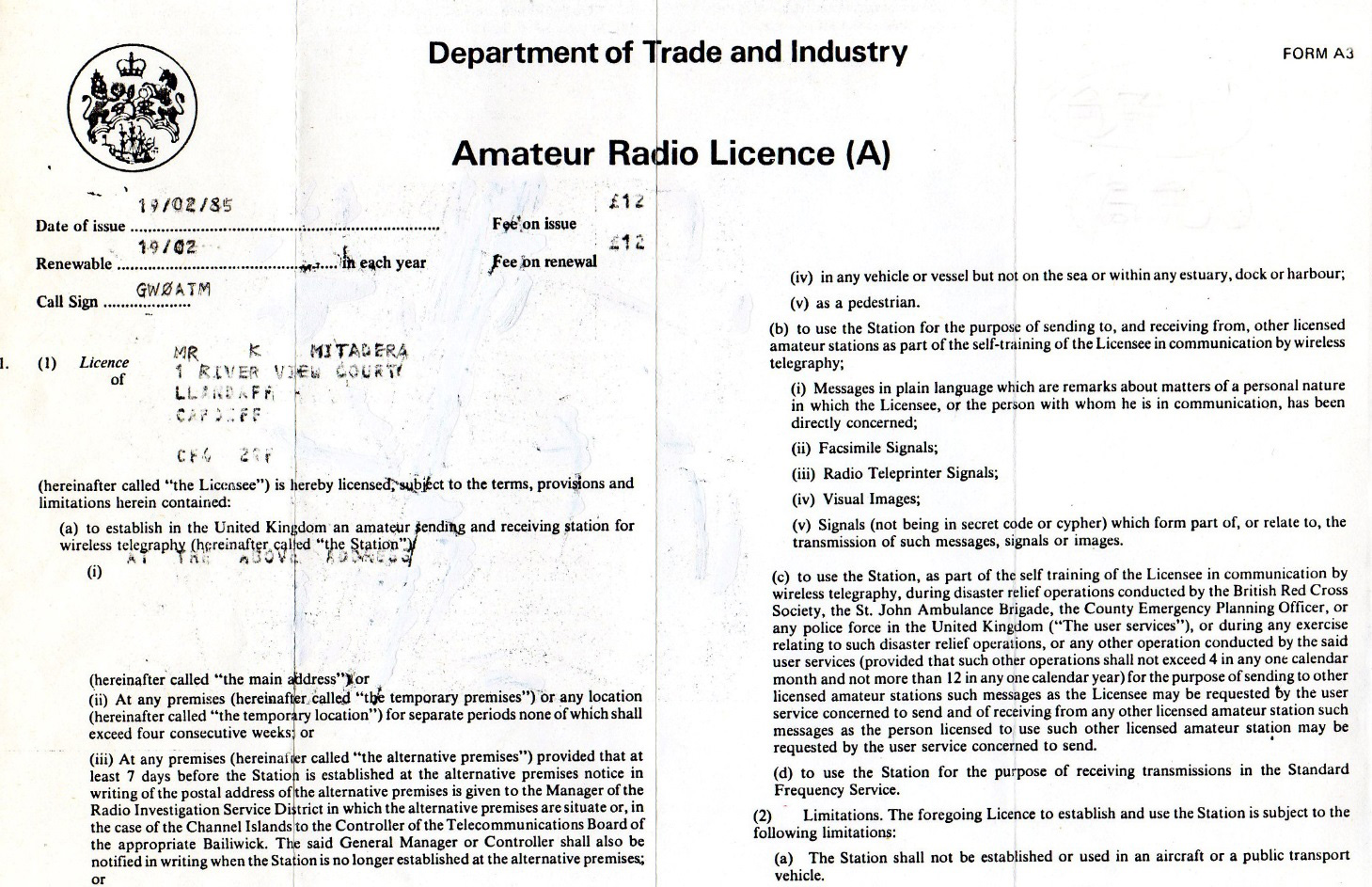 JG1GWL杉本賢治氏は、米国の免許をベースにしてG0/KE6QXを取得したとレポートしてくれた。「仕事で何回か行く可能性があり、外国人にも免許を出すように法規改正になったということなので、米国免許でG4YHC (JANETメンバー)の住所をお借りして書類申請しました。申請後4週間以内に免許が下りました。費用は£12 (約3,600円)で毎年更新可能です。残念ながらまだ運用の機会がありませんが、知人の局を使っての運用やHTを持って行って手軽に交信を楽しむことが出来ると思っています。(1985年5月記)」