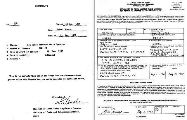 写真8. (左)JA1CB野村四郎氏の日本の従事者免許の英文証明書(1975年)。 (右)W6/JA1CB野村四郎氏の相互運用協定によるFCCへの運用許可申請書(1992年)。 (クリックで拡大します)