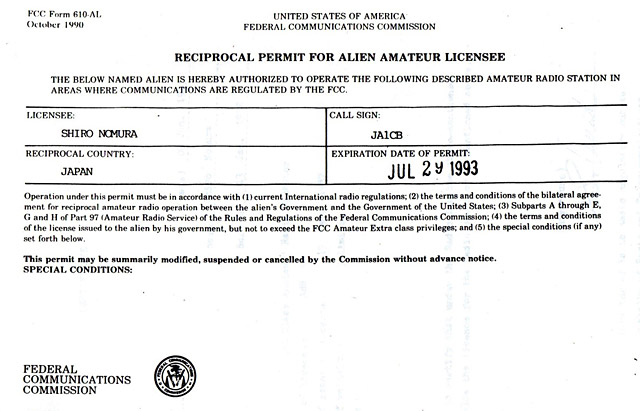 写真9. W6/JA1CB野村四郎氏の相互運用協定によるFCCの運用許可証(1992年)。