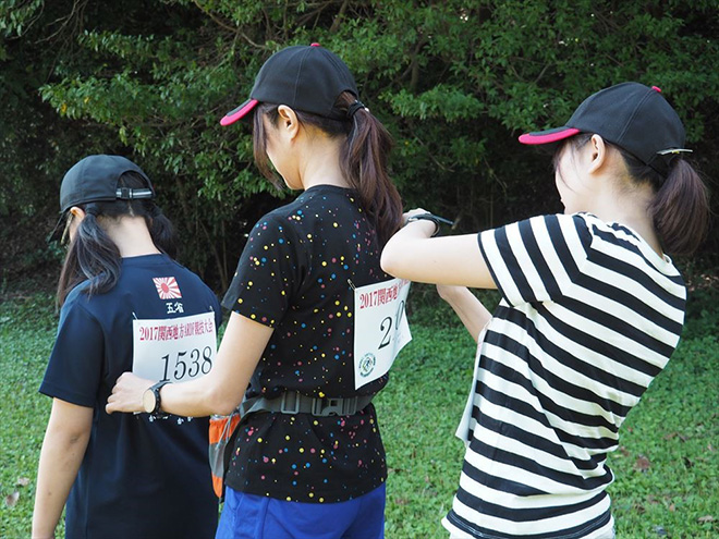 競技大会とはいっても、和気あいあいの雰囲気。女性同士、協力し合ってゼッケンをつける