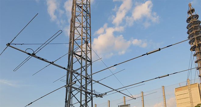 凄い施設を見せていただいた! という興奮の中、もう一度、ドコモ大阪南港ビルの前へ戻ってきました。次はいよいよアマチュア無線クラブのシャック見学! “ビルの中に無線室があって、アンテナはさっき見た屋上のタワーの上かしら…”と思ったら、皆さん、どんどんビルから遠ざかるほうに歩いて行きます。あれれ!?
