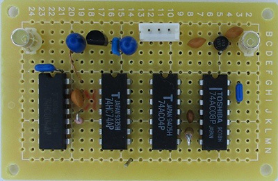 この高調波発生回路は47mm x 72mmの穴あき基板に組み立てました。CMOSのICはその一部のゲートしか使っていないのでもったいない使い方になっていますが、それぞれの用途になっているので仕方ありません