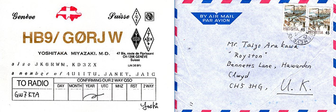写真1. (左)HB9/G0RJW宮崎吉孝氏QSLカードと、(右)それらが送られて来たスイスからの航空便封筒。
