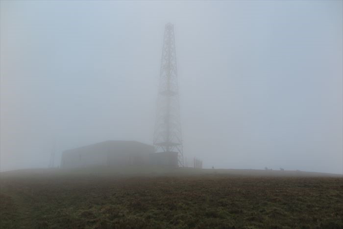 明確な登山道が途中から無くなり、牧場の中にあるPublic Foot Pathを登ったのですが、途中から霧の中に入りほとんど消失してしまい、牧場の急坂を登りました。霧の中の牧場をどんどん登ってようやく山頂の鉄塔が見えてきました。