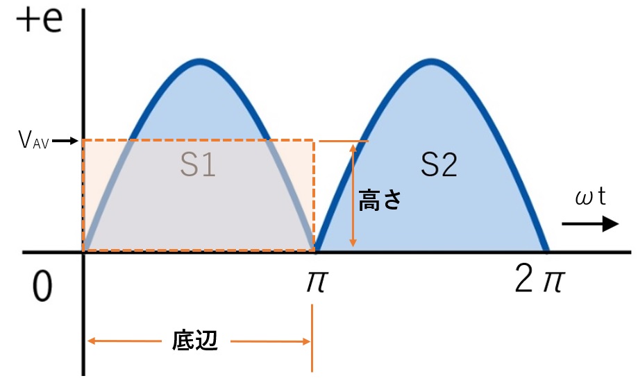 平均値とは、上がったり、下がったりする電圧の平均であると述べました。平均する範囲が図3の0~2πまでとするとS1とS2の平均は「正」の電圧と同じ「負」の電圧を平均するのでゼロとなってしまいます。そこで負の値S2をそのままひっくり返して正の値にします。正負の符号が異なるだけで相似形なので問題はありません。つまりS2の絶対値を取り、S1+|S2|の面積の0~2πまでの平均を取れば平均値を求められます。