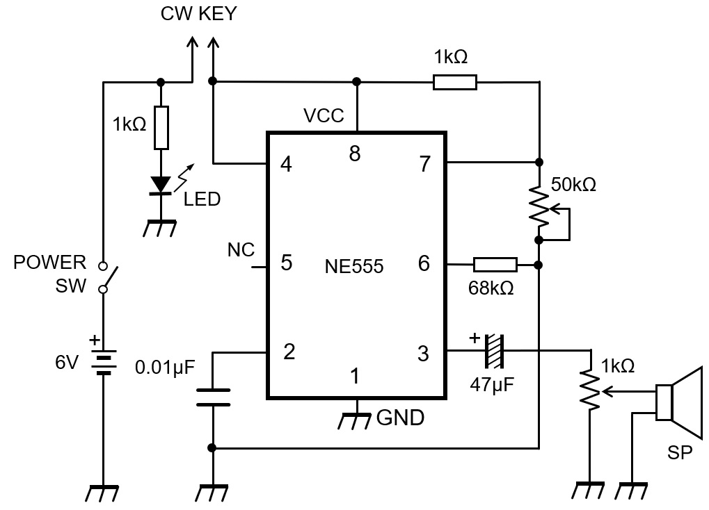 図3は、NE555を使った簡易モールス練習器です。POWER SWをONにするとLEDは点灯し動作状態であることを示しますが、NE555はCW KEYを押したときだけ電源がNE555に電源が供給される省エネ設計となっています。50kΩの可変抵抗器で600Hz~1kHzぐらいの範囲でトーンの発振周波数を可変させることができます。1kΩの可変抵抗器は、スピーカーのボリューム調整用です。