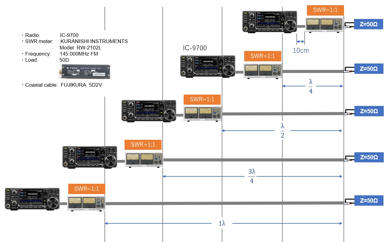 Figure 4 is an experiment to see if the matched antenna changes the SWR reading with the length of the coaxial cable. In other words, the SWR meter assumes that it is located near the radio. The experimental result was SWR=1:1 regardless of the length of the coaxial cable in each case.