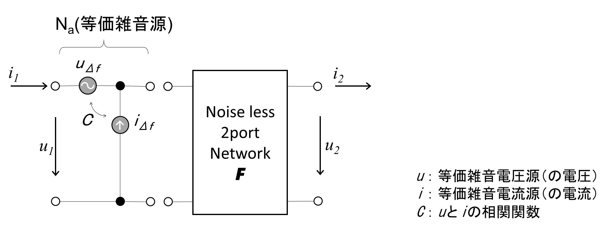 図2においてA、Bと書かれたポイントは図1のA、Bと同一箇所です。入出力の線形性が担保される条件下では、トランジスタ(増幅器)はノイズレスの2ポート(4端子)回路網と、その入力に縦続接続された雑音源(相関のある雑音電圧源と雑音電流源の組み合わせ→これも2ポート回路網)に置き換えることが可能です。図2では、”Noise less 2port network”がノイズレスのトランジスタの特性を表し、その入力端子に等価雑音源Naが接続されています。実際のトランジスタは、その内部で雑音を発生するわけですが、その全てを入力側に接続された電圧源、電流源に置き換えて表現しています(故に「等価」と書かれています)。なお、雑音電圧と信号電圧を区別するため、本図以降、雑音電圧の記号にはuを用います。また雑音電力は広い周波数帯域に分布するため、通常は電力密度(帯域幅1Hzあたりの電力)で表されます。これに対してSNRの定義で使用する雑音電力は、信号の周波数帯域に存在する雑音電力の事なので、図2に示した等価雑音電圧源、等価雑音電流源の記号には信号Sの帯域内の雑音電圧、電流という趣旨で添字"Δf"の添字をつけています。
