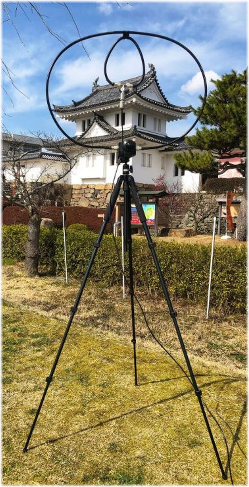 The 6 meter band is popular in Japan, so for this portable operation I chose to operate HF using the AL-705 Magnetic Loop Antenna (MLA) and 6 meters using a 3 element Yagi. The 6 meter Yagi antenna can be built with the components that come with the Deluxe Buddipole® system, the optional 6 meter Yagi kit, and other accessory components. The parts and assembly are detailed later in this article. I chose a location not far from the castle building and gate, on a small rise on the main bailey. All of my equipment was brought in using my cart. The forecast was for sunshine, so I brought my umbrella and later clamped it to the tripod. I am glad I brought it, as the sun later got bright, and it got a little warm. I set up the Yagi as the main antenna and the loop antenna on a camera tripod as a sub antenna. I also attached the IC-705 to a light plastic tripod and placed it on the folding camp table.