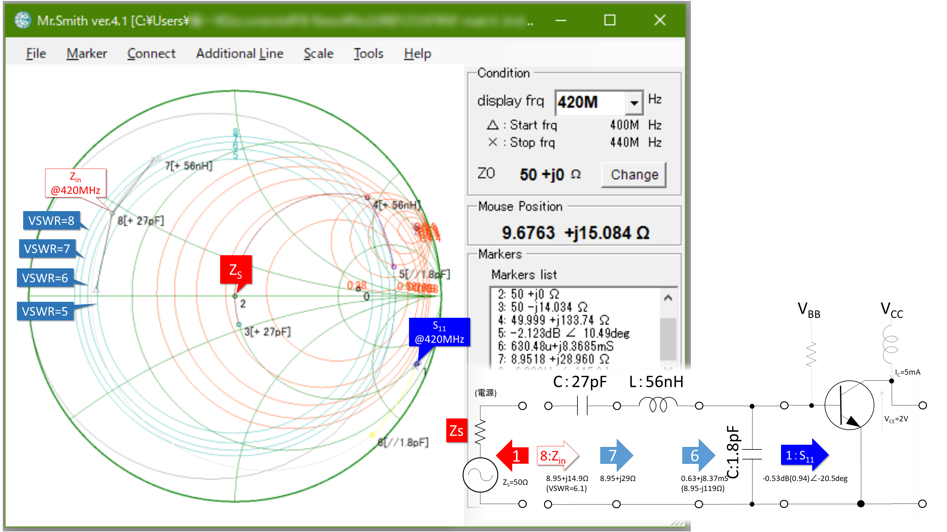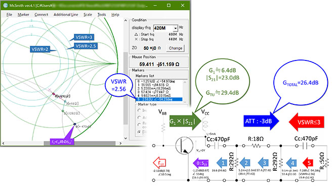 出力に3dBのアッテネータが挿入されるので、出力端子における利得は26.4dB、VSWRは2.6となります。トランジスタとアッテネータを接続するための結合キャパシタCCは、リアクタンスが設計誤差の要因になるので、キャパシタンスが大きい方が良いのですが、徒にキャパシタンスを大きくすると自己共振周波数が動作周波数にかかってくる可能性があるので、420MHzで|XC|≦1Ωを目安に470pFとしました。