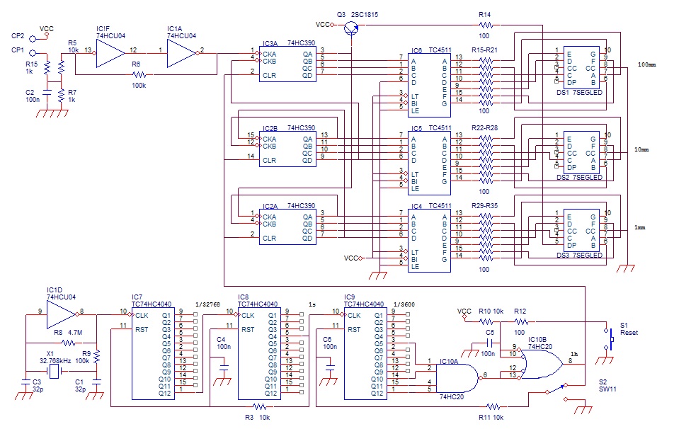 この表示器で1時間当たりの雨量を測定するためには1時間のタイマーが必要です。IC1Dのゲートと32.768kHzの水晶の発振回路を源信としてIC7とIC8で分周して1秒の信号を作ります。その信号をIC9で1/3600に分周して1時間のタイマーを作っています。IC10AとIC10Bで取り出した信号で1時間毎にIC9にリセットをかけてカウンターを元に戻し、その信号でIC2A~IC3Aのカウンターにリセットをかけて1時間毎の計測をします。1時間単位の雨量でなく累計の雨量を測る場合はS2を切り替えます。1時間単位の雨量の測定にはJSTに合わせてリセットスイッチS1を押す必要があるかも知れません。