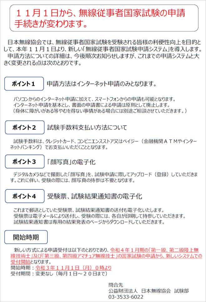 日本無線協会では、無線従事者国家試験を受験される皆様の利便性向上を目的として、本年11月1日より、新しい「無線従事者国家試験申請システム」を導入します。