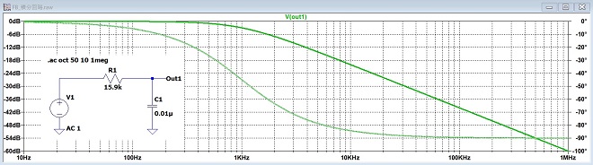 ここからはオペアンプの発振の主要因となる積分回路に話しを絞ります。下の図は積分回路を2段重ねた特性です。定数から計算して頂くと分かりますが1段目の積分回路のfcが1kHzで2段目は10kHzになっています。緑の線が1段目の出力で青の線が2段目の出力です。