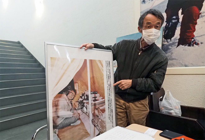 畑さん(JH3QFL)が手にもつ写真パネルは、西堀さんが1973年のヤルン・カン登頂で、テント内からアマチュア無線を運用したようすです!!